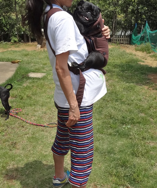 人間の赤ちゃん用の抱っこヒモでぴのこを抱えたまま散歩。